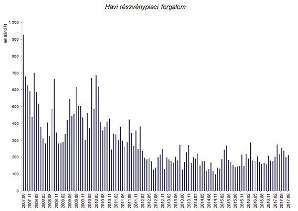 Augusztusban 212,3 milliárd forint értékben kötöttek üzleteket a Budapesti Értéktőzsde (BÉT) azonnali részvénypiacán, ami nemcsak a júliusi érteket haladja a meg (198,2 milliárd forint), de a tavalyi év hasonló időszakában mért értéket is (158,36 milliárd forint). A nyári szabadságolások még mindig meglátszanak a forgalmi adatokon, a napi átlagforgalom az augusztusi 23 kereskedési napon 9,2 milliárd forint volt, ami kevesebb az előző havi (9,4 milliárd) értékhez képest, de jelentősen meghaladja a tavaly augusztusi értéket (6,9 milliárd).