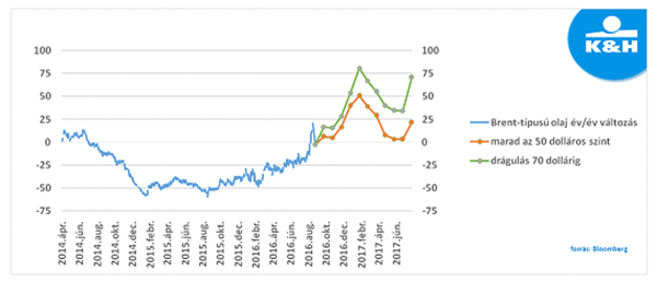 Előretekintve két esetet vizsgáltunk: a narancs vonal a „nem történik semmi izgalmas” verzió, azaz a következő 12 hónapban végig 50 dollár körül mozog majd a kőolaj, míg a kék vonal a „fokozatos emelkedés”-t mutatja, vagyis lassú, minden negyedévben 5 dolláros emelkedés történik, egészen 70 dolláros olajárig.