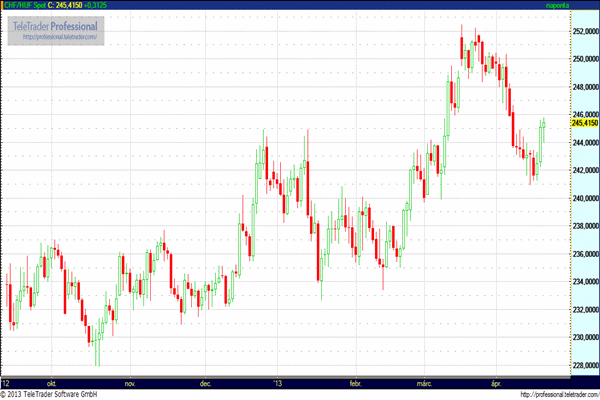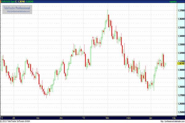 EUR/USD (1,3010 – 1,3130): Bár tegnap előtt közel volt hozzá, újfent nem boldogult az 1,30-as szinttel a dollár. Tegnap napközben az európai problémák (sikertelen olasz elnökválasztás, az IMF vezér kamatvágást sürgető nyilatkozata) ellenére is csak szűk sávban mozgott az árfolyam. A délutáni, ismét rosszabb amerikai adatok hatására vette a kereskedés az 1,31-es szint felé az irányt. A továbbra is a várttól elmaradó számok a QE3 program és a zéró kamatok fenntartását valószínűsítik az USA-ban, ami a kamatelőnyön keresztül jót tesz a közös európai pénz árfolyamának.