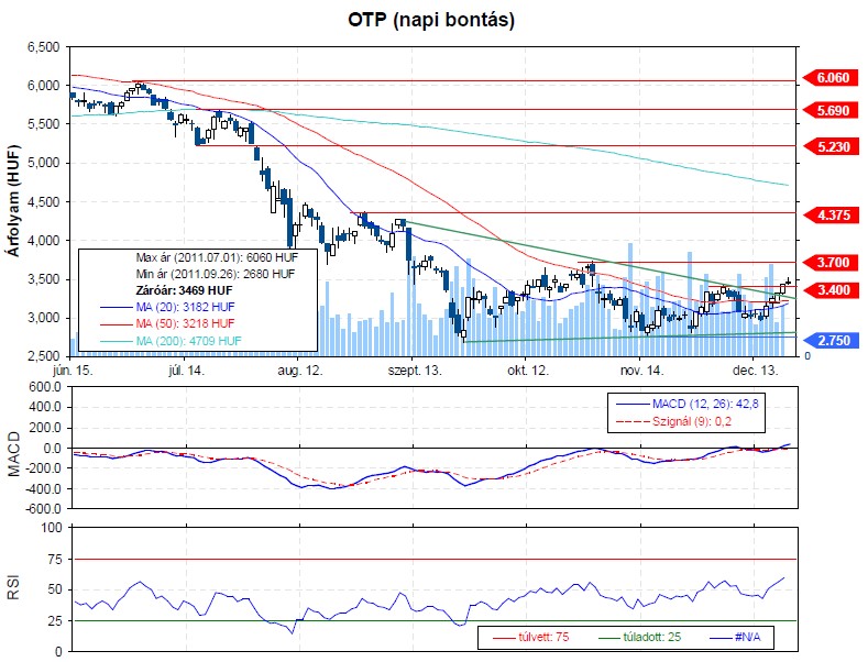 - Szárnyra kapott az OTP. A múlt hét második felében és az elmúlt napokban is nagyot emelkedett az árfolyam. Több ellenállást is sikerrel leküzdött a bankpapír, a csökkenő trendvonal, és a 3.400 forintnál látható korábbi lokális maximum sem tudta megállítani a kurzust.