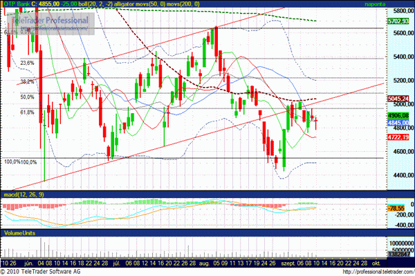 Emiatt ismét felerősödtek az aggodalmak az európai bankszektor kilátásait illetően, ami a bankrészvények árán is érződött. Az OTP-nek ezen a héten sem sikerült az 5.000 forintos lélektani határ fölé kerülnie. A bankpapír 0,90 százalékos gyengüléssel, 4.855 forinton zárta hetet.