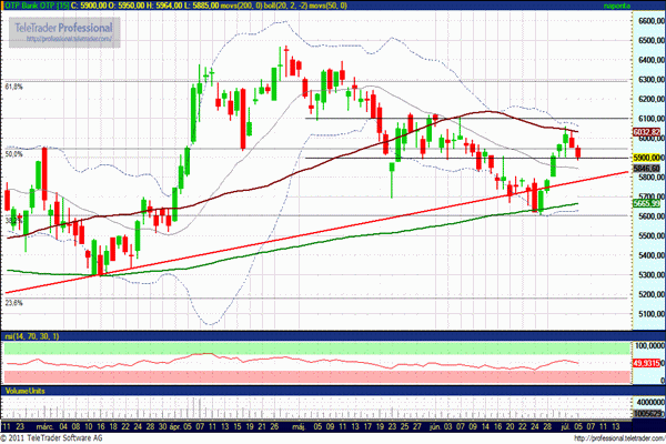 A tegnapi nappal egyértelművé vált, hogy lefordult az 50 napos mozgóátlag jelentette ellenállásról az árfolyam. Megmaradt a 200 és az 50 napos mozgóátlagok közötti sávozás. A csökkenést az 5900 forintos szint még megfogta, azonban várhatóan a mai napon további esés várható, miután a Moodys aggresszív mértékben tovább rontotta Portugália adósbesorolását.