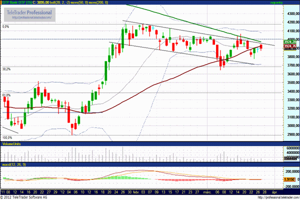Zárva tartja az utat felfelé az 50 napos mozgóátlag, hiába nyitott emelkedéssel az árfolyam, a napot ismét 3900 forint alatt zárta. Miután a pozitív nemzetközi hangulatban sem tudott erősödni, így a hangulat romlása gyors esést eredményezhet.