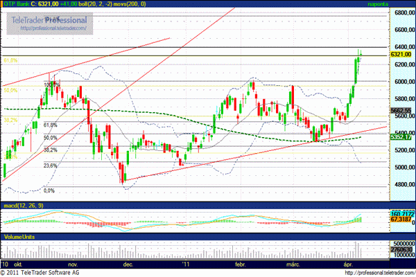 Kiemelkedően teljesített az OTP a múlt hét során, mint ahogy az európai tőzsdéken is a bankszektor papírjai szerepeltek a legjobban. Emellett az OTP emelkedésében közrejátszott a 72 forintos osztalékjavaslat bejelentése is, valamint a kormány adósmentő csomagjával kapcsolatos várakozások.Az OTP részvények ára egy hét alatt 10,03 százalékkal 6.321 forintra nőtt. Nézzük, mit hozhat a folytatás.
