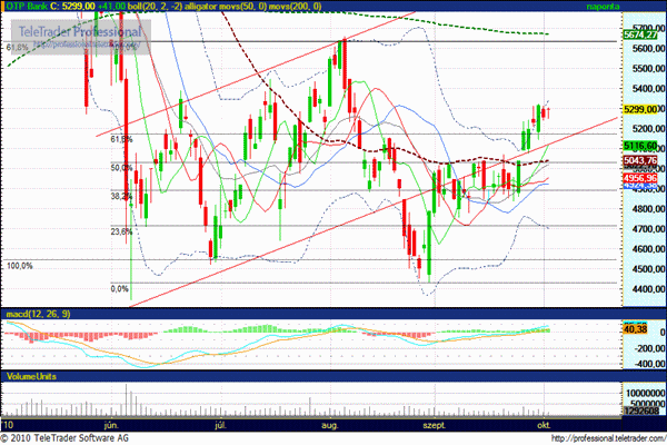 Az OTP erejét mutatja, hogy az alacsony forgalom ellenére sem esett tegnap - ellenére az európai tőzsdék lejtmenetének - , hanem az 5.300 forintos szinten ragadt. Az OTP részvények ára 41 forinttal, 0,78 százalékkal 5.299 forintra erősödött, forgalmuk 6,7 milliárd forintot tett ki. Nézzük, mire számíthatunk a folytatásban...