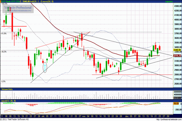 Az 50 naposról mutatott emelkedés után pénteken alacsony forgalmú esés mutatkozott, miután a szimmetrikus háromszögből mutatott kitörés áll, sőt a 3340 forintos szint felett is meg tudott maradni, így pesszimizmusra a leminősítés ellenére sincs még ok. A két ünnep között valószínűleg marad az 50 napos mozgóátlag és 3500 forintos szint között.