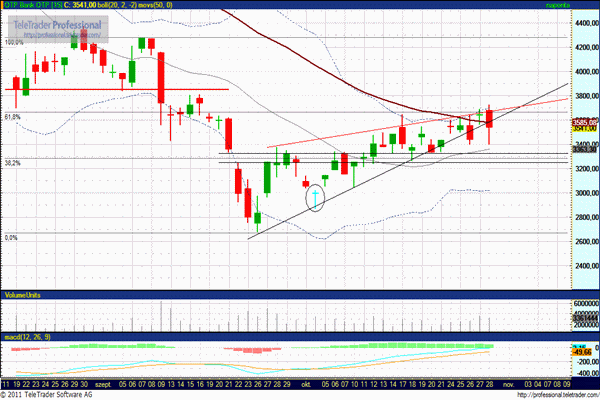 Jó eséllyel réssel indulhat az esés, ha elesik a 3250 forintos szint, akkor leszaladhat az árfolyam a Bollinger-szalag aljáig, 3000 forintig.