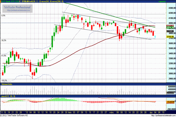 Egy lépcsőfokkal ismét lejjebb lépett az árfolyam, ezáltal tesztelésre került a 3700 forintos szint is, a borús nemzetközi hangulat ellenére nem esett alá. A doji star alapján bizonytalanság mutatkozik a folytatást illetően, azonban ha a hangulat nem javul a nemzetközi piacokon, akkor folytatódhat az esés és törhet a 3700 forintos szint is. Emelkedés során ellenállás 3750, 3775 forintnál.