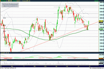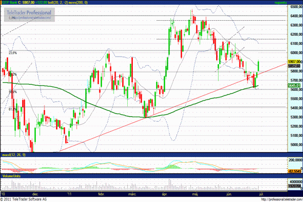 Úgy tűnik, hogy márciushoz hasonlóan a 200 napos mozgóátlag jelentette támasz most is megállította az esést, most már csak az a kérdés, hogy a sávból bekövetkezett letörés visszatesztelését látjuk, avagy újra emelkedő pályára állt. 5900 felett 6100 forintig szabad az út.