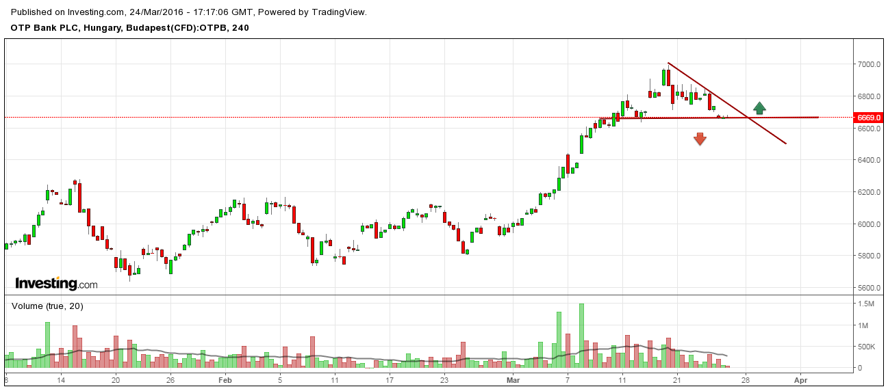 Letörte a zászló lobogóját csütörtökön az OTP, technikailag visszalépett a kép egy kis lecsorgásba. Amennyiben visszatöri a képen behúzott ferde trendvonalat a részvény úgy visszaindulhat a jegyzés, addig azonban marad a bizonytalankodás.