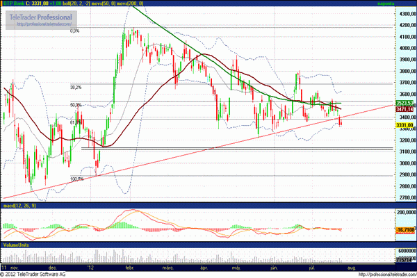 Ugyan nem esett tovább az árfolyam a tegnapi kereskedés során, azonban aggodalomra ad okot, hogy nem tudott visszatérni az emelkedő trendvonal, illetve a 3400 forintos korábbi támasz fölé az árfolyam.