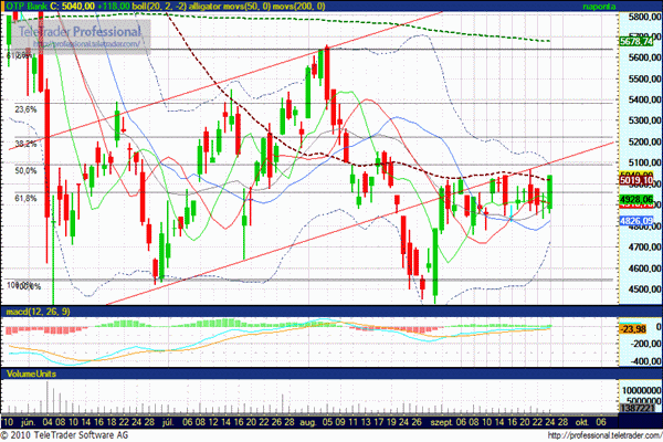 A péntek délutáni ralinak köszönhetően, újabb próbálkozás indult az ellenállás áttörésérére. A hétfői napon, a további emelkedés során az 5100 forintos szint átlépése lehet számára a legfőbb feladat, amelynek sikere után visszakerülhet az emelkedő sávba.
