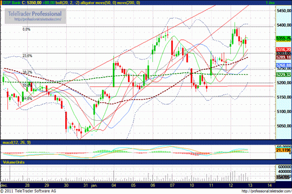 Éppen ezért a további emelkedés várható, ha sikerül az 5400 forintos szinten átlépni, akkor megcélozhatja a 200 napos mozgóátlagot is, 5500 forintnál. Támasz 5300 forintnál.