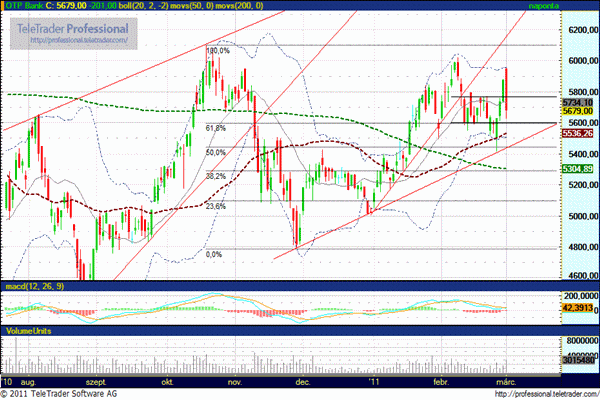 A hétfői emelkedést teljes mértékben elnyelte a tegnapi esés, ezzel a kitörés behaltnak tekinthető. Várhatóan újra az emelkedő trendvonal tesztelése következhet, így további csökkenés során támasz 5600, illetve 5500 forintnál mutatkozik. Emelkedés során ellenállás 5750 forintnál.