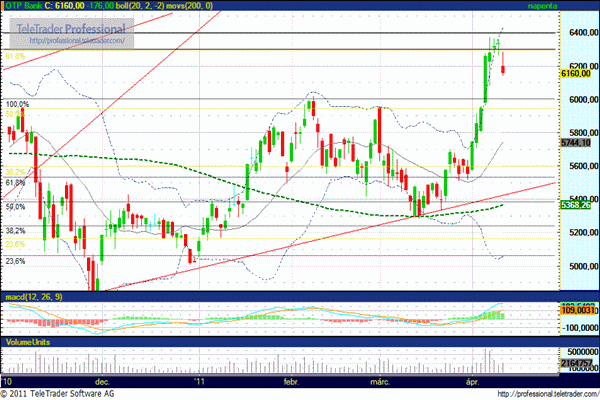 A budapesti börze alulteljesítő volt Európában, a kontinens indexei jellemzően 1,5 százalék körüli mínuszban zártak, míg a BUX 2,5%-ot esett. A budapesti börze rosszabb teljesítményének oka, hogy a múlt héten nagyon jól teljesített a BUX, és most a negatív nemzetközi hangulathoz ennek a nagy emelkedésnek a korrekciója is hozzáadódott. Az OTP részvények ára 176 forinttal, 2,78 százalékkal 6.160 forintra esett, forgalmuk 13,8 milliárd forintot tett ki. Mai elemzésünkben a bankpapír várható árfolyam alakulását tekintjük át a technikai elemzés eszközeivel.