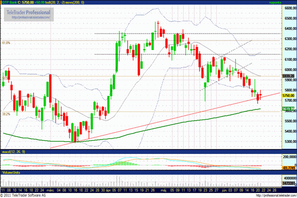 A tegnapi oldalazás ellenére azonban az irány továbbra is lefelé mutat, a 200 napos mozgóátlag irányába 5600 forintig. Emelkedés során ellenállás továbbra is 5775-5800 forintnál várható.