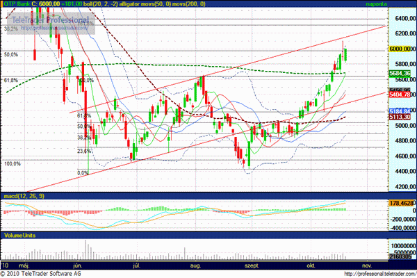 A Budapesti Értéktőzsde részvényindexe, a BUX 150,95 pontos, 0,64 százalékos emelkedéssel, 23.628,15 ponton zárt szerdán. Szerdán - ahogyan mostanában szokták -, vették a papírokat, a forgalom legnagyobb részét az OTP adta erősödéssel, de kicsit a Magyar Telekom is "magához tért", mivel kiderült, hogy az elemzői várakozásokhoz képest kicsivel kevesebb adót kell fizetnie a cégnek. Az OTP részvények ára 101 forinttal, 1,71 százalékkal 6.000 forintra erősödött, forgalmuk 12,8 milliárd forintot tett ki. Nézzük, mire számíthatunk a folytatásban a bankpapírtól: OTP technikai elemzés.