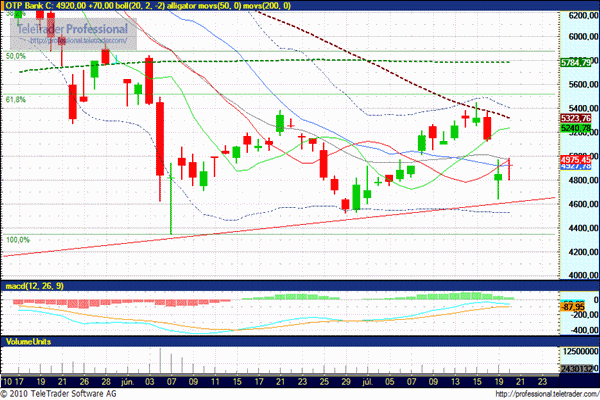 Tulajdonképpen stagnált az árfolyam, túlnyomórészt a hétfői 4850-4950 forintos sávban folyt a kereskedés a keddi napon. Még igazán korrekcióra sem futotta, az 5000 forintos ellenállást meg sem próbálta áttörni. Vételeket még továbbra sem érdemes erőltetni, pláne 5000 forint alatt, illetve a nyitva lévő rés árnyékában.