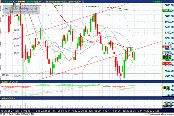 Mivel a támasz kitartott (4750), így továbbra is van esély arra, hogy megpróbálkozzon visszatérni az emelkedő sávba, azon belül viszont az 50 napos mozgóátlaggal (5040) kell megbirkóznia. Felszabadultabb emelkedés 5100 és 5220 forint felett jöhet csak. Csökkenésben támasz 4850 és 4850 forintnál.