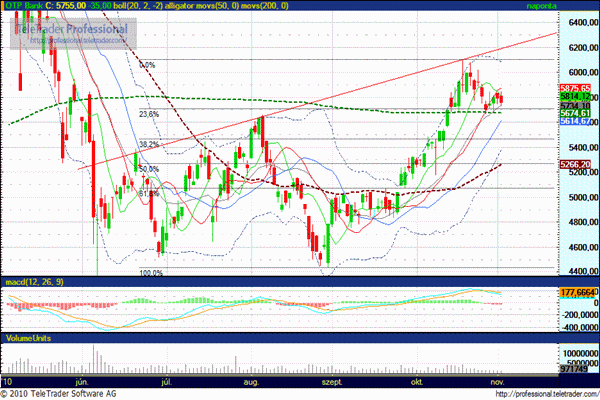 Támasz 5700 forintnál, melynek törése után 5450, illetve 5250 forintos szintek jöhetnek. Vételek szempontjából érdekessé csak 5850 forint felett válhat.
