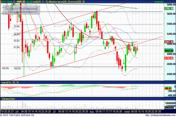 Nem tudott folytatódni a szerdai emelkedés, miután az árfolyam még a sáv előtt elakadt a 61,8% Fibo szintben. Várható volt, hogy nem lesz könnyű visszakapaszkodni, de az esély még mindig megvan, mivel a támasz még sértetlen (4750).