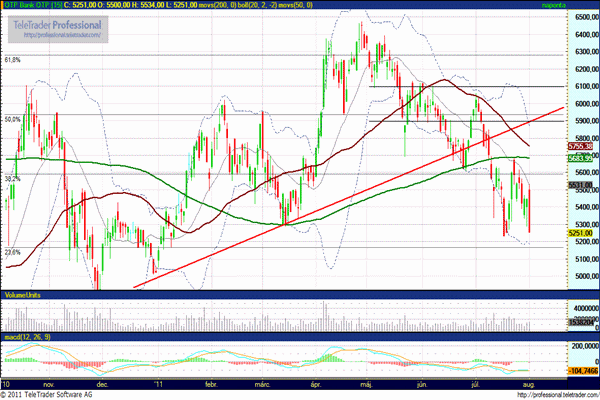 Reggel még a pénteki emelkedés lendületét meglovagolva eljutott 5500 forintig, a 20 napos mozgóátlagról azonban élesen lefordult a gyorsan romló piaci hangulat következtében. Az OTP részvények ára 199 forinttal, 3,65 százalékkal 5.251 forintra esett, forgalmuk 8,3 milliárd forintot tett ki. A méretes eséssel visszatért 5300 forint alá, elnyelve a csütörtöki és a pénteki napon mutatkozó emelkedést. Ha nem tud visszakapaszkodni 5300 forint fölé, akkor további csökkenés következhet 5160 irányába.