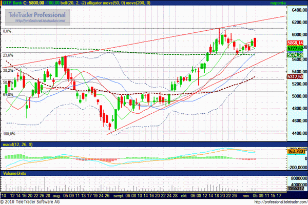 Ameddig a szeptember elején megindult emelkedő trendvonalat sem éri el, addig az előbb említett sávon belüli oldalazásra lehet leginkább számítani. Maga az emelkedő trend él, ezért eladásokban egyelőre értelmetlen gondolkodni. Az elmúlt két hét leginkább konszolidációnak tekinthető.