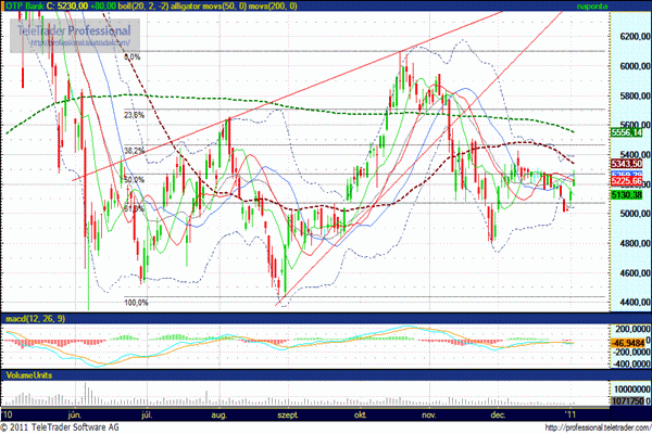 Rést hagyva maga mögött folytatódott az árfolyam emelkedése, nekifutott az 5270 forintos ellenállási szintnek is, az átlépés azonban elsőre nem sikerült. Új év, új lehetőség, a nemzetközi optimista piaci hangulat nyomán kap lehetőséget arra, hogy kilépjen az 5100-5270 forintos sávból.