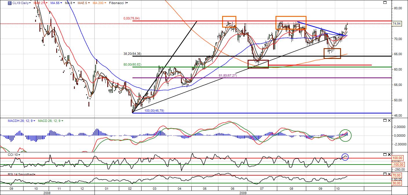 A pozitív vállalat eredmények némi optimizmust hoztak a piacokra, ami segítette a részvény piacok emelkedését, ezzel a dollár gyengülést. Pillanatnyilag már nem lehet érezni azt a magabiztos emelkedést a piacon, mint néhány hónappal ezelőtt. A befektetőknek most már egyértelműbb jelekre lenne szükségük ahhoz, hogy biztosak legyenek a dolgukban. Véleményünk szerint addig nem érdemes pozíciót foglalni a termékekben, míg nem lépi át a 75,83$-os csúcsot nagy momentummal. Amíg ez nem következik be, csakis a magas kockázat marad a befektetőknek és egy rendkívül hektikus piac.