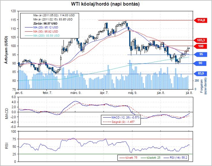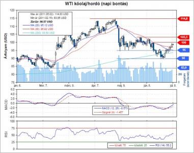 Az elmúlt hetekben sokat változott a technikai kép. Pár héttel ezelőtt a 95 dolláros támasz és a 200 napos mozgóátlag törésével megerősítette az árfolyam a csökkenő trendet, és így további esésre számítottunk. A technikai kép azonban hirtelen pozitív irányba fordult, és jelenleg már főként vételi pontokat érdemes keresni az olajban.