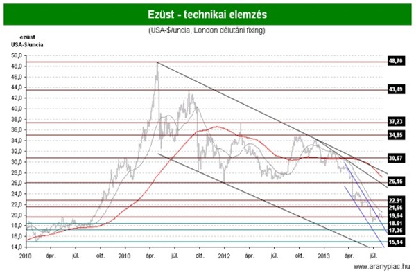 Jól jellemzi az aranyár útkeresését a különböző trendcsatornák közé ékelődő jelenlegi árfolyamszint. Miután az utóbbi napokban sikerült kitörni a meredeken zuhanó pályáról, megadatni látszik az esély egy szerényebb dinamikával csökkenő sávba való visszakapaszkodásra. Persze ez is még csak egy csökkenő pálya, ami azt jelenti, hogy egyelőre koránt sincs szó egy új aranykor felragyogásáról. De ez az enyhébb lankájú lejtő technikailag mégis csak engedhetne teret talán egy akár 1.700 dollárig is érő emelkedésre. Ugyanakkor az árfolyam lekonyuló vége – az elmúlt hét londoni záróárainak az eredménye – minden további forgatókönyvet lehetővé tesz. Lehet ennek kapcsán szó visszatesztről az elhagyott meredeken eső trendcsatorna határáig, ami egy „egészséges” jelenség és az erőgyűjtés jele lenne a további emelkedéshez. Másfelől a bikák kifulladása is tükröződhet abban, ahogy a puha landolást jelentő trendcsatorna alsó széléről az utóbbi napokban lefordult az árfolyam. Az 1.260 dollár környéke ennek tükrében egy kritikus támaszszintnek tűnik, amely alatt újult dinamikával folytatódhat a szabadesés. Az 1.355 dolláros bástya meghódítása viszont a kitörést jelenthetné az elmúlt hónapok sanyarúságából.