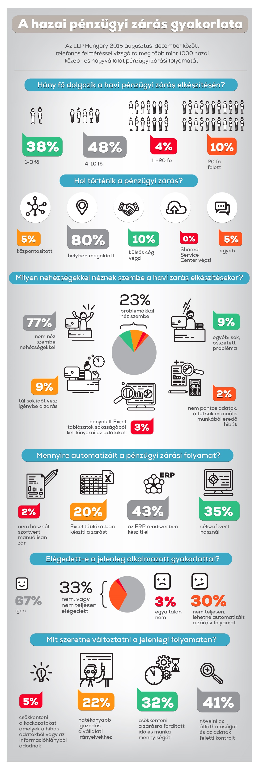 Az LLP Hungary 2015 augusztus-december között telefonos felméréssel vizsgálta meg a hazai közepes és nagyvállalatok pénzügyi adminisztrációs gyakorlatán belül a pénzügyi zárás folyamatát. A kutatás során 1166 hazai közép- és nagyvállalatot kérdeztek meg, köztük tőzsdén jegyzett vállalatokat, hazánkban működő SSC-ket, meghatározó észak- és nyugat-európai, amerikai, japán, illetve dél-koreai tulajdonossal rendelkező vállalkozásokat, valamint a magyar TOP600-as lista cégeit.