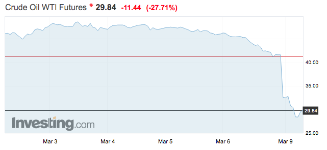 Mindeközben ha az árupiacokra nézünk, akkor hangosan felkiáltunk, hogy "asztaaaaaaaaaa!", mert az olaj tőzsdei jegyzése ma reggelre 27%-ot zuhant.