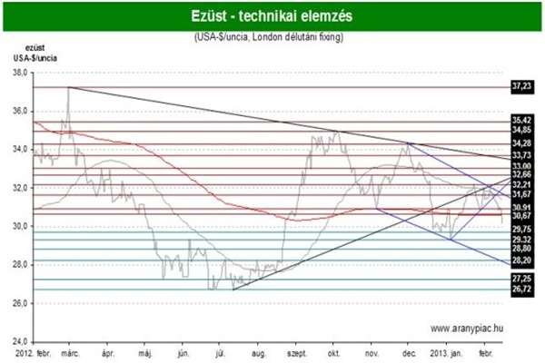 Az ezüst grafikonja szintén híján van biztató jeleknek, a rövidtávon emelkedő tendencia itt is kifulladt. Ugyanakkor az ezüst még fáziseltolódásban van az aranyhoz képest. A 200-napos mozgóátlagot éppen csak, hogy átszelte a jegyzés, és a január elején látott mélypont is még odébb van. Amíg a csökkenő trendcsatornán belül alakul az árfolyam, addig egy kontrollált korrekcióval van dolguk.