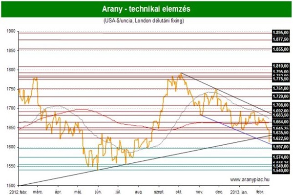Kritikus fontosságú a továbbiakat illetően, hogy most a csökkenő trendcsatornán belül marad-e a jegyzés vagy esetleg tart-e tovább a zuhanás. Amennyiben ez utóbbi következne be, akkor nagy valószínűséggel nem lenne megállás a tavalyi évben látott mélypontokig 1.540-1.550 dollárnál. A csatornán belül maradva viszont ismét hosszú hetekig oldalazhatna az árfolyam, mire döntés érlelődne a további irányt illetően. Egyedül egy trendfordulónak nincs semmilyen jele az aktuális technikai grafikonon.