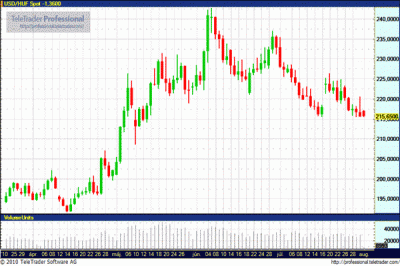 Az amerikai fizetőeszköz gyengült a forinthoz képest, mert vasárnap este 217,59, míg pénteken este 217,48 forinton jegyezték 1,3020 dolláros euró árfolyamnál. A svájci frankért hétfőn délelőtt 205,88 forintot adtak az előző esti 209,14 és a péntek esti 208,55 forint után.