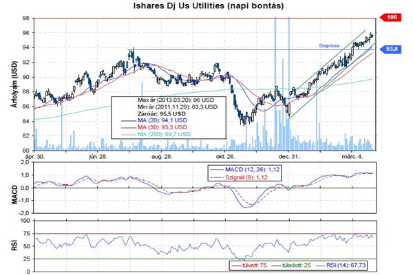 Az erős trendben a közműszektor is könnyedén emelkedik, és a közeljövőre nézve is pozitívak a kilátások. A további rallyt nem gátolja erős ellenállás, így a 106 dollárnál megjelölt célárfolyamot továbbra is elérhetőnek gondoljuk.