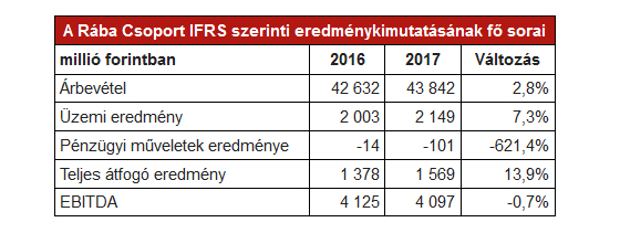 A Rába Csoport tovább fokozta hatékonyságát és nyereségességét 2017-ben: a bővülő árbevétel mellett üzemi eredménye 146 millió forinttal nőtt az előző évhez képest, és az operatív nyereségesség is javult. A társaság készpénztermelési hatékonysága a tavalyi évben is megőrizte az iparági átlag feletti szintet, a megtermelt EBITDA-tömeg 4,1 milliárd forintot tett ki, hatékonysága 9,3 százalékot ért el.