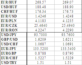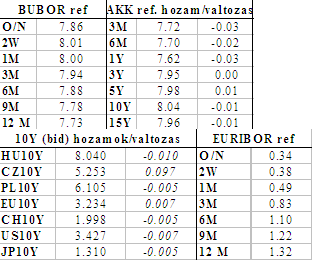 A forint a várakozásoknak megfelelően a 266-269-es sávban mozgott tegnap az euróval szemben.  A várakozásoknak megfelelően a lengyel jegybank tegnap 3.5 százalékon változatlanul hagyta az alaprátát. Az iparban és a kiskereskedelmi forgalomban tapasztalható pozitív jelek, a vártnál lassabb dezinfláció és a holnap napvilágra kerülő GDP – amivel kapcsolatos várakozások szerint Lengyelország továbbra is elkerülte a recessziót, így elképzelhető, hogy meg is menekül tőle – hatásainak eredőjeként nem ítéltek szükségesnek újabb monetáris lazítást. Ennek ellenére elképzelhető még egy 25 bázispontos vágás az elkövetkező három hónapban, de meredek kamatcsökkentésekre „már” nem számítunk. Ezen adat sem a zlotyt sem a forintot nem mozgatta meg érzékelhető mértékben. Jelentős mértékben egyelőre nem csökkent a kockázatvállalási hajlandóság, de az amerikai felülvizsgált GDP adatok előtti bizonytalanság miatt 269-ig kúsztak fel mostanra a jegyzések. Amennyiben jóval rosszabb lesz a tengerentúli GDP akkor egyértelműen 270 fölé fog gyengülni a hazai deviza az euróval szemben. Egyéb esetben a 267-270-es sávot tartjuk a legvalószínűbbnek az euró/forint kurzus számára csütörtökön. (Értelem szerűen adott esetben jobb adat mellett az előző sáv aljára, sőt az alá is lejöhetnek a jegyzések.) A régiós tőzsdék, így a BUX is halvány pluszban jár ma reggel, az államkötvény-aukciókon ismét nagy túljegyzést várunk.