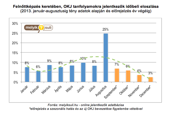 Az augusztusi hónap kivételével idén viszonylag kiegyensúlyozottan alakult a felnőttképzésekre jelentkezők időbeli eloszlása a melyiksuli.hu portál jelentkezési statisztikái alapján. Mérsékeltebb, átlag alatti érdeklődés csak februárban, valamint a júliusi kánikula idején volt tapasztalható, miközben augusztusban minden korábbi évnél nagyobb érdeklődés volt megfigyelhető: az egész évben folyamatosan induló tanfolyamokra jelentkezők aránya jelentősen meghaladta a tavalyi évben mért 20 százalékot. A jelentkezők kiugró száma a szeptember 1-től életbe lépő változásoknak köszönhető: sokan előrehozták jelentkezésüket, hogy még a régi OKJ feltételei szerint szerezhessenek szakképesítést. Ez azonban óhatatlanul a későbbi, őszi keresletet veti majd vissza, az őszi hónapok a tavalyi évben átlag felett járultak hozzá az egész évben jelentkezők arányához.