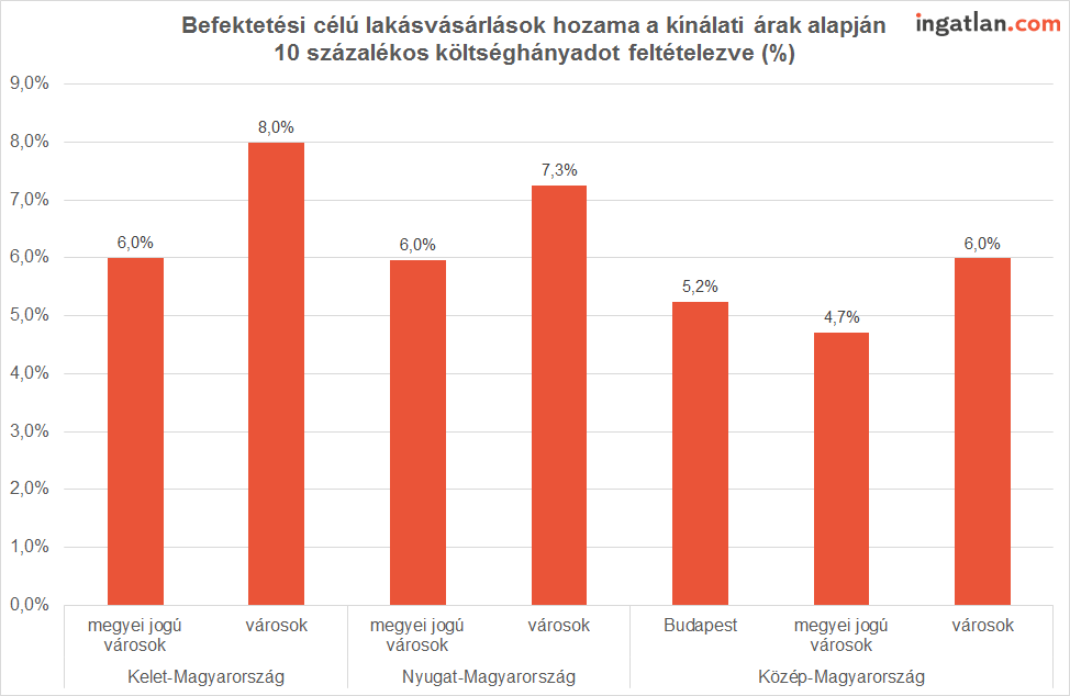 Az ingatlan.com adatai szerint szeptember közepén Budapesten 512 ezer forint volt a használt lakások átlagos kínálati négyzetméterára, ami 17 százalékos növekedésnek felel meg egy év alatt. Balogh László, az ingatlan.com vezető gazdasági szakértője szerint a fővárosban idén szeptemberben az átlagos négyzetméterárak és bérleti díjak alapján a hozam több mint 5 százalékos volt. Az ország más nagyvárosaiban pedig akár 6-8 százalékos hozam is elérhető. Balogh László szerint a befektetési vásárlások az albérletárakat hosszabb távon mérsékelhetik, egyben stabilizálhatják. A kereslet lényegében adott az albérletpiacon, ami a nagyvárosokban felszívja a kínálatot. A befektetési lakásvásárlások miatti kínálatbővülés pedig lejjebb szoríthatja a bérleti díjakat. “A hozamok még enyhe albérletárcsökkenés mellett is kedvezőbbek lehetnek a többi megtakarításhoz képest. Nem beszélve arról, hogy a fővárosi és vidéki nagyvárosi ingatlanok felértékelődése ehhez extraként jöhet hozzá” - tette hozzá a szakember.