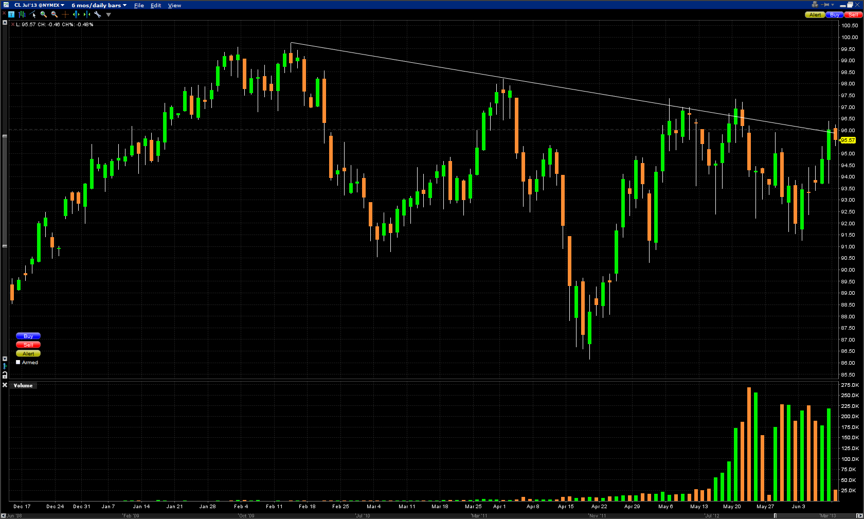A másik lehetőség, ha nem akarunk megválni részvényünktől, a „mellé kereskedés” folyamata. Érdemes terpesz opciókat kiírni egy-egy árupiaci termékre, annak érdekében, hogy prémiumot tudjunk kicsípni a piacról. Erre az egyik legalkalmasabb termék a crude olaj.