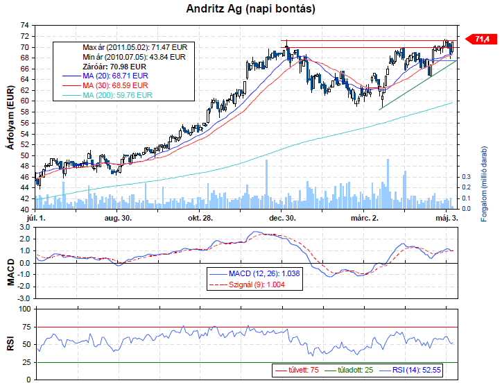 Az év elején véget ért emelkedést követően kezdett kialakulni a fülescsésze formáció, mely hamarosan egy kitöréssel fejeződhet be. A technikai kép alapján minden adott a további emelkedéshez, és a 71,4 eurós ellenállás áttörése esetén intenzív hegymenet kezdődhet. Az alakzatból számított célár alapján rövidtávon 82 euróig is elmehet az árfolyam, melyet az Erste fundamentális elemzése is alátámaszt.