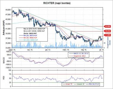 A Richter 14,3-as P/E rátán forog, miközben normál időszakban 15-20 közötti értéken szokott állni. A cég tavaly történetének legnagyobb eredményét érte, el, s idén jó esélye van annak, hogy az idei eredmény a második helyen szerepeljen. Pláne azok után, hogy végül is tavalyi orvoslátogatói és rabat befizetéseket jóváírhatja a cég. Így ez az idei eredményt mintegy 2,4Mrd Ft-tal megdobja (+5%).