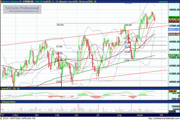A Budapesti Értéktőzsde részvényindexe, a BUX 43,86 pontos, 0,19 százalékos csökkenéssel, 22.807,82 ponton zárt szerdán. A részvénypiac forgalma 16,7 milliárd forint volt, a vezető részvények a Magyar Telekom kivételével gyengültek az előző napi záráshoz képest. A Richter papírok árfolyama 500 forinttal, 1,04 százalékkal 47.600 forintra csökkent, a részvények forgalma 619,6 millió forintot ért el. A másik gyógyszeripari részvény, az Egis 117,4 millió forintos forgalom mellett 170 forinttal, 0,81 százalékkal 21.130 forintra erősödött. Mai elemzésünkben a Richter árfolyamát vesszük nagyító alá.