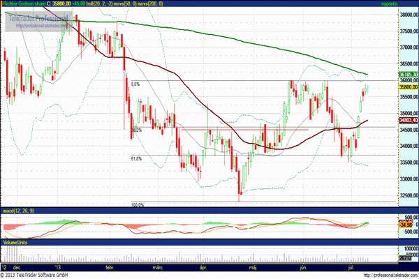 Az ellenállás érintését követően akár profitrealizálás is indulhat, amely során támasz 35.000 (3.500) forintnál várja. (Az 1000 Ft névértékű részvényekkel tegnap lehetett utoljára kereskedni, az új, 100 Ft névértékű részvényekkel ma indul a kereskedés. A 2013. július 11-i Tőzsdenapra vonatkozó bázisár 3.580 Ft-ban került meghatározásra.)