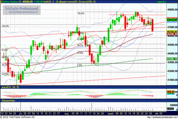 Bár a nemzetközi piacok lefelé mozdultak el szerdán, a budapesti kereskedés hangulata pozitív volt. Nem is zárt volna mínuszban a BUX, ha a Richter nem esett volna nagyot. A gyógyszerpapír csökkenésének oka lehetett, hogy október 1-jén változik a BUX kosara, a Richternek kisebb lesz a súlya az indexben, az Egisé pedig nagyobb. A Richter papírok árfolyama 1100 forinttal, 2,31 százalékkal 46.500 forintra esett, a részvények forgalma 1,7 milliárd forintot ért el. A másik gyógyszeripari részvény, az Egis 225,6 millió forintos forgalom mellett 5 forinttal, 0,02 százalékkal 22.305 forintra emelkedett. Mai elemzésünkben a Richter várható árfolyam alakulását tekintjük át.
