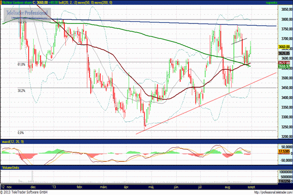Az 50 és a 200 napos mozgóátlagok jelentette támaszról újraindult emelkedés gyorsult be a pénteki kereskedés során. Várhatóan újra támadást indít a 3750 forintos szint ellen. Az emelkedés mellett szól az aranykereszt, azaz az 50 napos mozgóátlag alulról keresztezte a 200 naposat. Támasz 3620, illetve 3580 forintnál.
