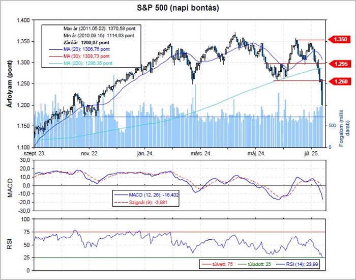 Bár a piac erősen túladott, amíg nem csillapodik a pánik, ne számítsunk komoly korrekcióra. A következő támasz az S&P500-ban 1.175 pontnál látható, ellenállást pedig az 1.260 pontos letörési szint jelent.