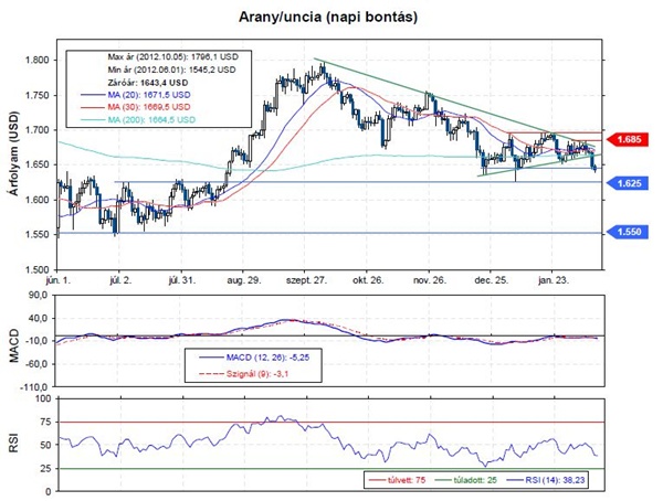 Eladásra javasoljuk az aranyat, miután tegnap letört az árfolyam egy szűkülő alakzatból, ami megerősíti a kialakult csökkenő trendet. Az arany kurzusa tavaly októberig jól teljesített, majd 1.800 dollárról lefordult, és jelenleg is tartó csökkenő szakasz rajzolódott ki. Alacsonyabb csúcs és mélypontok jelentek meg a grafikonon, vagyis egy stabil csökkenő trendről beszélhetünk. A 200 napos mozgóátlag az elmúlt hónapokban próbálta megtartani az árfolyamot, miközben egy szűkülő alakzat rajzolódott ki. A vevők végig távol maradtak az arany piacától, a szűkülésből tegnap lefelé vette az irányt az árfolyam. Az 1.645 dolláros támasz is veszélybe került, a legvalószínűbb forgatókönyv, hogy folytatódik a csökkenés.